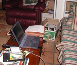 Doug has opened an "office" in the den . . .