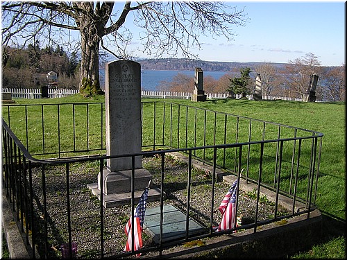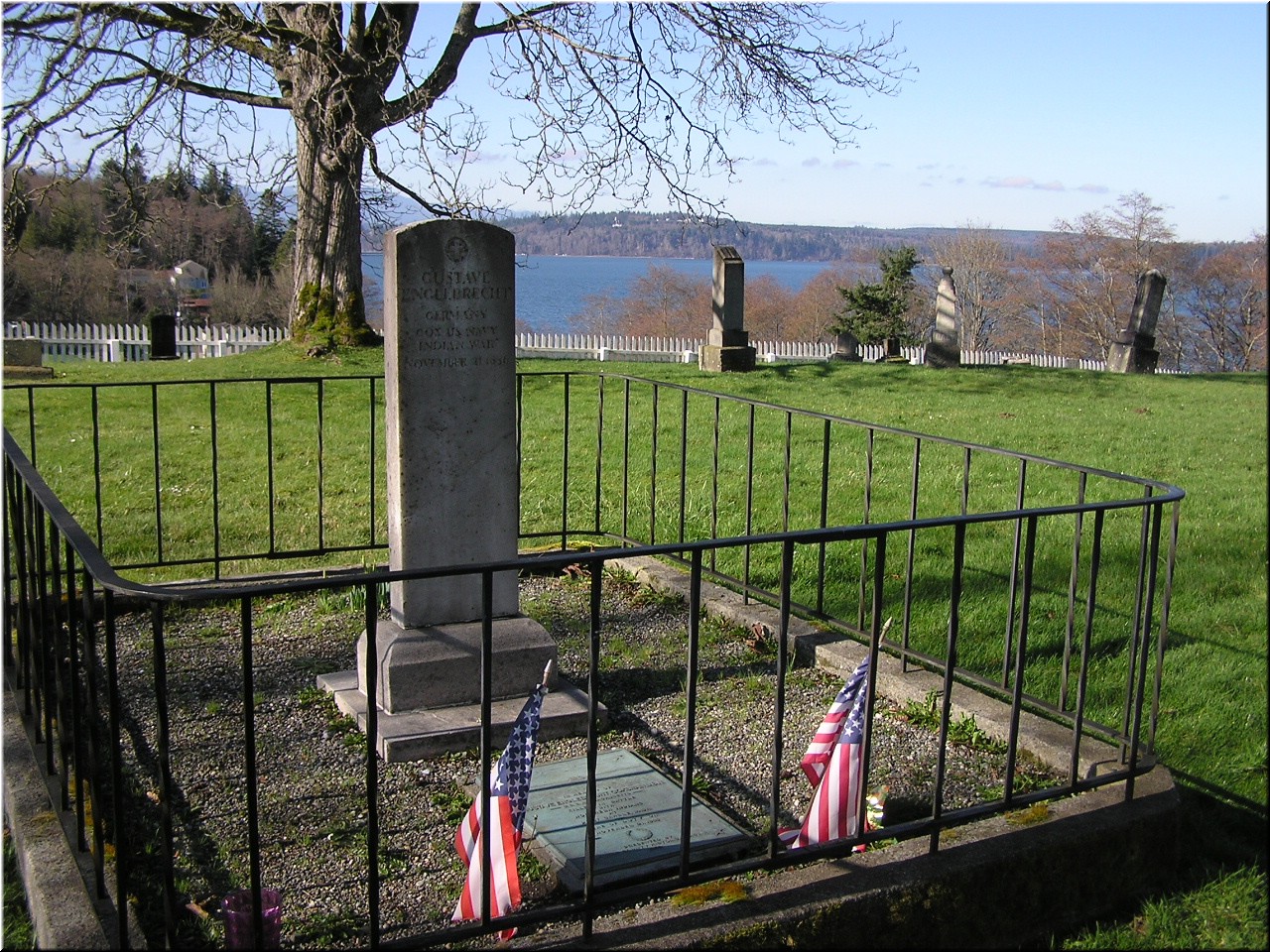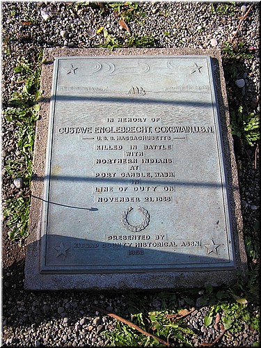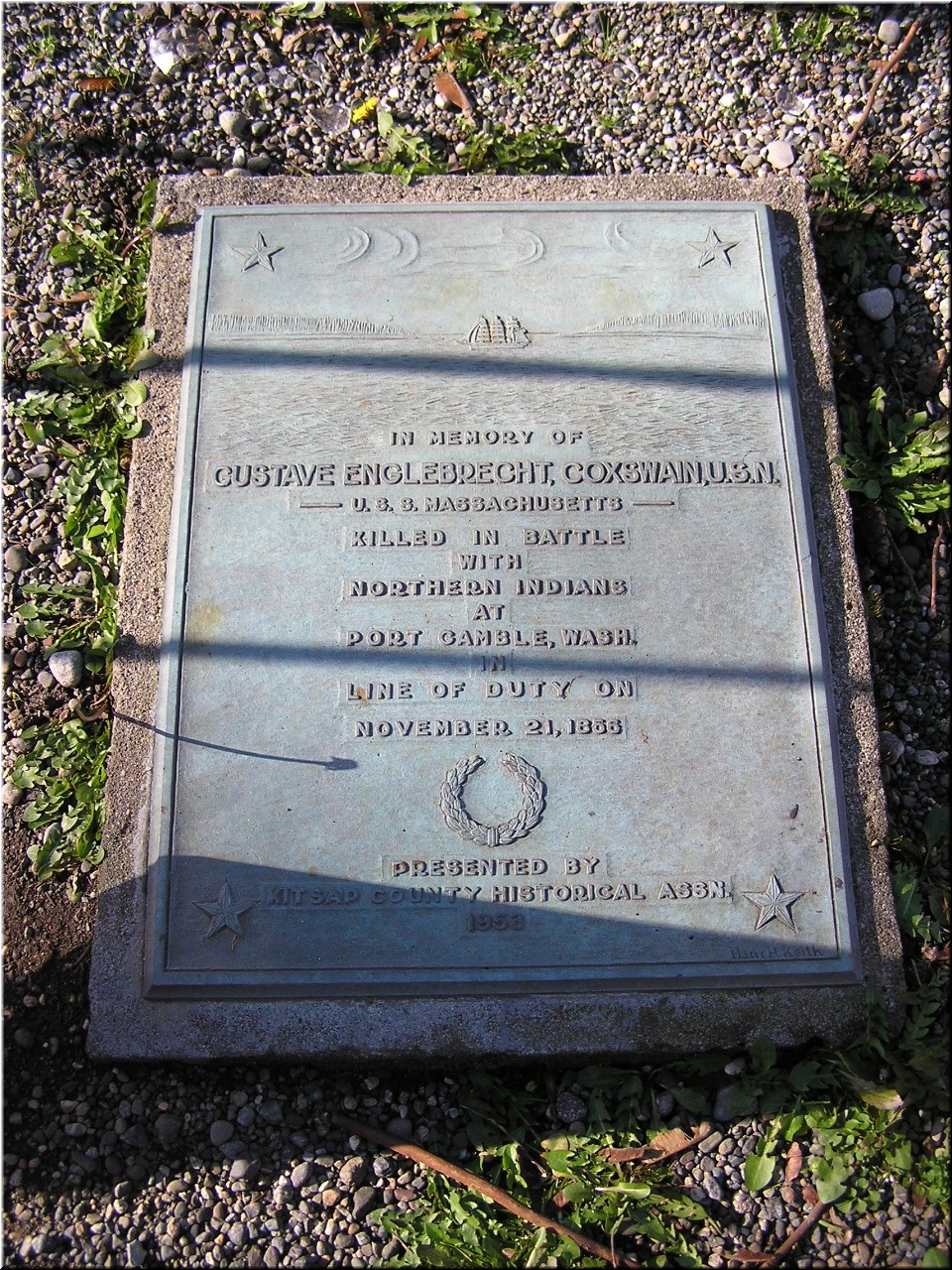 2-8-2005 Port Gamble The first U. S. Navy man to die in battle in the Pacific, 1856. "In one exchange, Coxwain Englebrecht fired his weapon and struck a Haida man. He raised his head from behind his defensive position and was struck fatally in the head by a Haida bullet." |